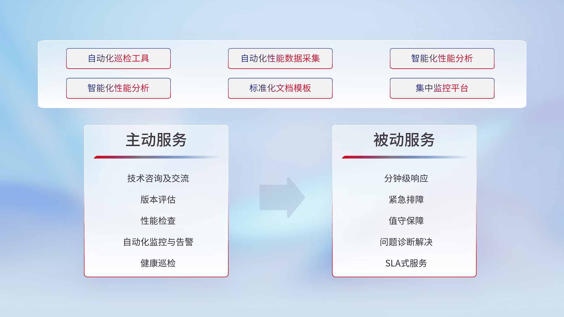 智能化工具和标准化文档,,保障服务质量,,,提供主动服务(包含技术咨询、、版本评估、、、性能检查、、自动化监控与告警、、、健康巡检)和被动服务包含(分钟级响应、、、、紧急排障、、、值守保障、、问题诊断解决、、SLA服务)。。
